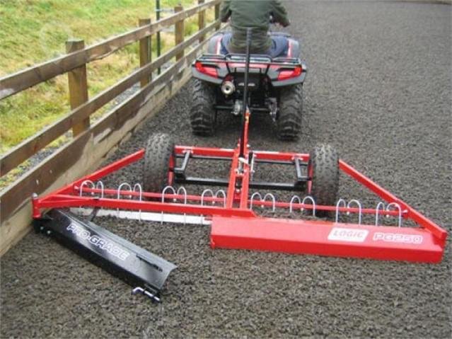 | What does this do? It can be towed behind any suitable vehicle for the arena composition (if available, a quad is ideal for this sort of application because of its low ground pressure). The Grader is light to tow, but it really works extremely well and can offer 'one pass' levelling to ensure the arena is quickly back to its smooth, neat and level best, ready for the next session. What's more Logic's unique design ensures that this grader really does provide the best level surface possible, with none of the skipping or bevelling that can occur with less well-designed graders. Why do I need one? The Logic PG250 features optional special tines which are highly recommended for these surfaces, restoring the even response which is the reason for investing in such a surface in the first place. The speed and ease of the operation has to be seen to be believed, quickly restoring your scuffed-up super-surface to its pristine best. Where do I use it? How does it work? The grader blade has a 'perimeter plough' section which opens to allow material built up around the edge of the arena to be pulled away from the boards before levelling. A rubber skid on the outer edge of this section prevents damage to side boards. The optional tines penetrate into the surface, effectively redistributing the material to the chosen depth. The wheel track levelling skids provide an absolutely level track for the wheels to run on, so preventing any skipping of the blade that can happen if the wheels jump over a particularly big bump. The depth adjustment is easily set, and the unit can be raised and lowered for transport or to allow the unit to be reversed into difficult corners. surface grader | pg250t | arena leveller | menage grader | level menage | manege grader | school leveller | school grader | |
